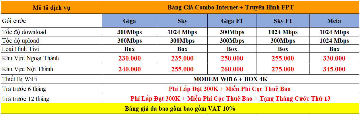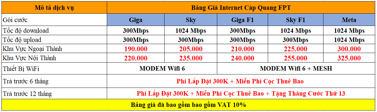Bảng Giá Cước Cáp Quang và Truyền Hình FPT